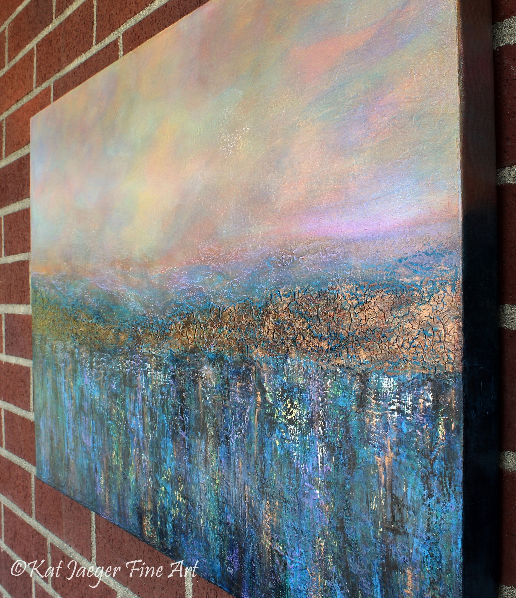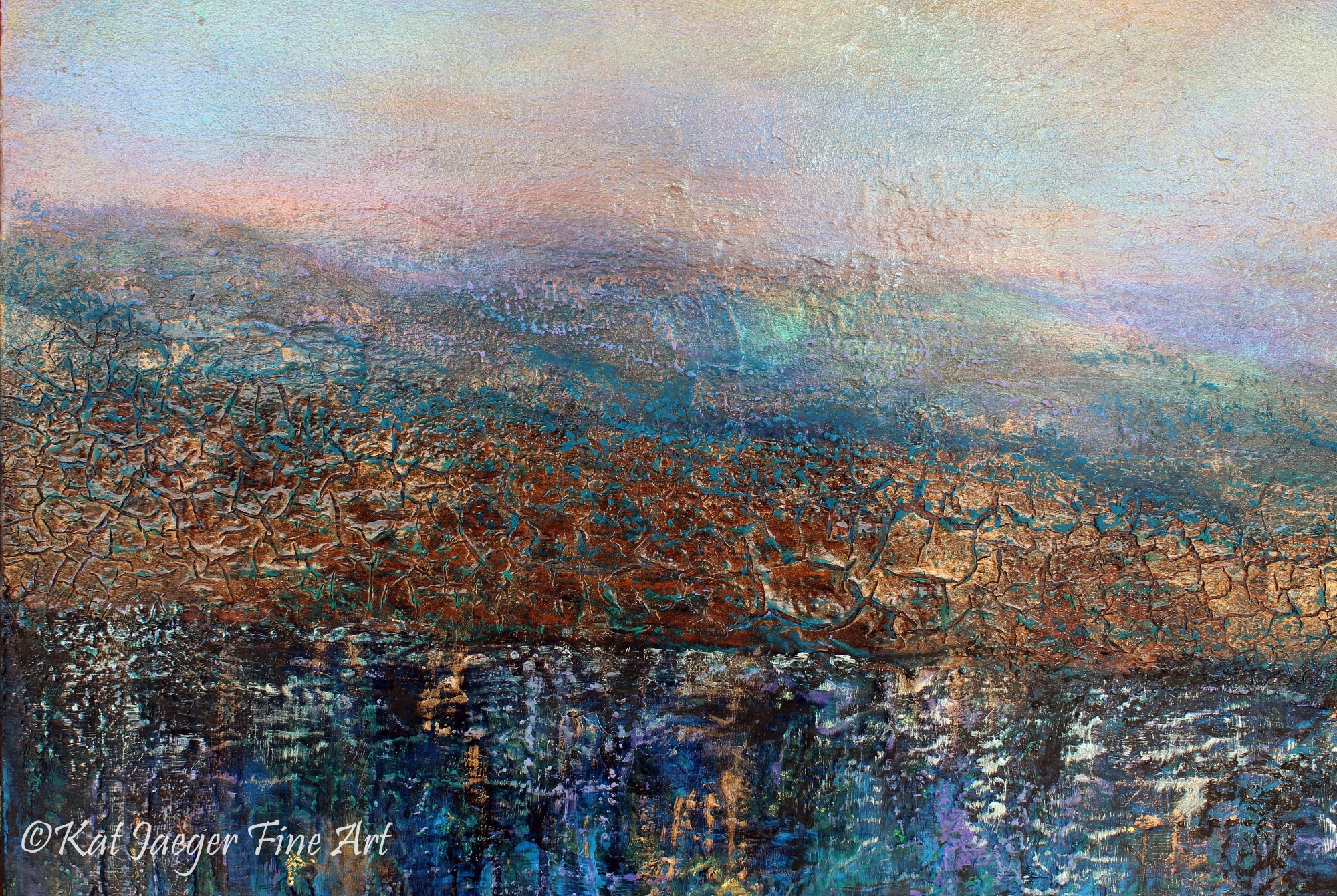 Abstract Textured Mixed Media Landscape with metallic copper accents and rich jewel tones on a Craquelure horizon and a luminous, pearlescent sky of soft, pastel shades.